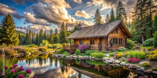 Naklejka premium Log Cabin Reflection in Serene Lake, Water Reflection, Log Cabin, Mountain...