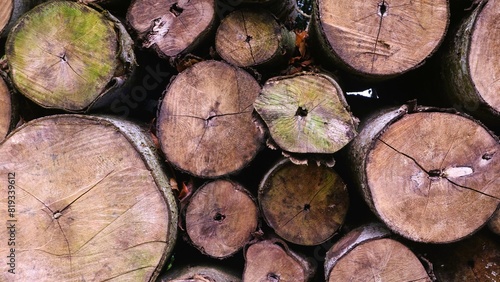 © Wahjoekris, Naklejka premium Log trunks pile, Wooden trunks pine, Logging timber wood industry. Stack of the trees trunks in deforested forest in the morning. Deforestation concept. environmental issue