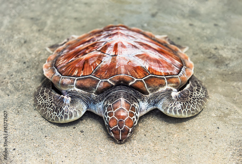 Obraz premium loggerhead the loggerhead sea turtle rests on the water's edge on the sand on...