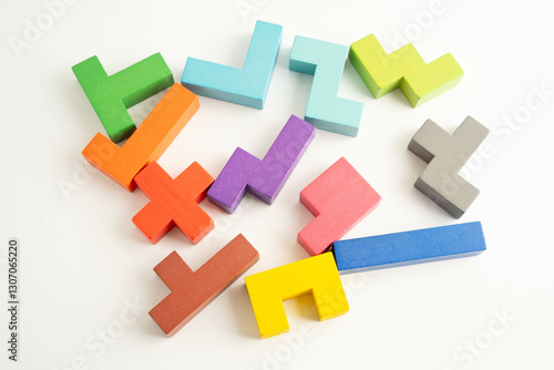 © manassanant, Obraz premium Logical thinking and problem solving problem solution creative business, wooden puzzle geometric block shape.
