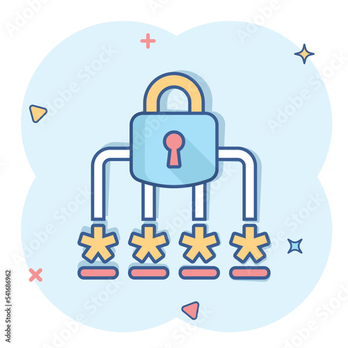 © Lysenko.A, Obraz premium Login icon in comic style. Password access cartoon vector illustration on white isolated background. Padlock entry splash effect business concept.