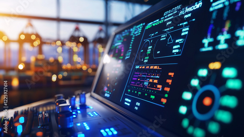 © Kateryna, Obraz premium Logistic Ship Port Control Panel with Digital Interfaces and Dials
