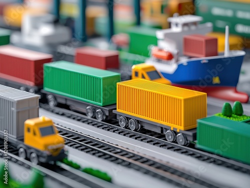 © Tonton1541, Fototapeta premium logistics cargo shipping cost-effective concept. Colorful miniature cargo containers and vehicles on a train track in a bustling port scene.