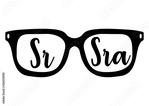 Fototapeta premium Logo aislado con silueta de gafas de sol con letras de palabra Sr y Sra en español en texto manuscrito para su uso en invitaciones y tarjetas