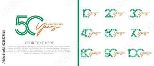 Naklejka premium logo anniversary set. green color with brown handwriting on white background for special event