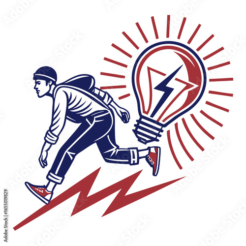 Obraz premium Logo design with running person, lightning bolt, and glowing light bulb