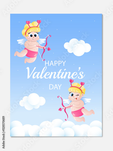 Fototapeta premium Logo love is in the air for Valentine's Day. Vertical card with cute angels cupids with bow and arrows on a blue background with clouds. Vector illustration