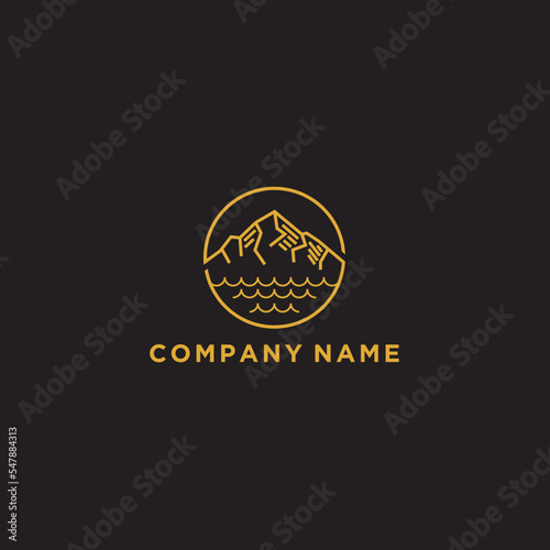 © satrio, Naklejka premium logo of mountain and sun views. Modern outline design illustration of a sun and mountain view on a lake. Vector art line icon template