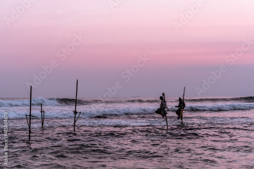 Naklejka premium Lokalni tradycyjni rybacy wędkarze na palach w oceanie na tle zachodzącego...