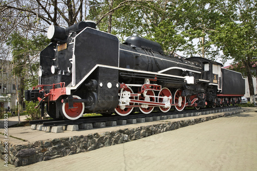 Fototapeta premium Lokomotywa parowa w pobliżu stacji kolejowej w Jużnosachalińsku. Wyspa...
