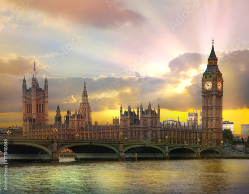 Naklejka premium London at sunset. Beautiful idealistic sunset behind the Big Ben and Houses of Parliament