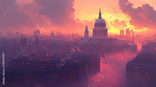 © AGUNG, Obraz premium London cityscape at sunset, enveloped in a mystical fog