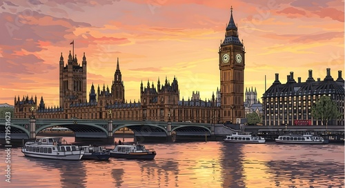 © dikifajarfadilah, Naklejka premium london cityscape at sunset iconic big ben and houses of parliament reflected in thames symbolizing british culture tourism great britain landmarks