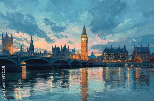 Naklejka premium London cityscape at twilight, reflecting in the river