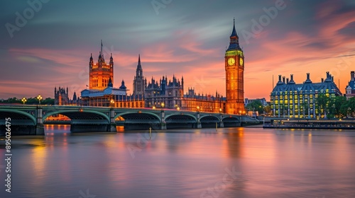 © Khalil, Obraz premium London cityscape with Big Ben Tower clock and City of Westminster and bridge, illuminated at dusk in England