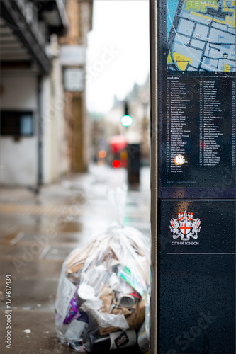 Obraz premium London, December 27th 2021: A bag of garbage next to a London street sign
