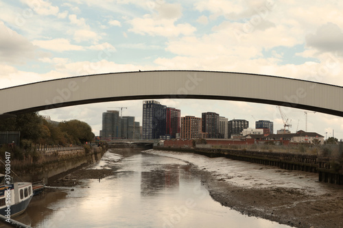 Naklejka premium LONDON ENGLAND 01 AUGUST 2020 view of caning town from river lea Cody Dock...
