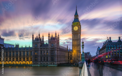 © zgphotography, Obraz premium London, England - The Big Ben and the Houses of Parliament at dusk with beautiful colorful sky and clouds