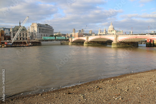 Naklejka premium London, England / UK - September 3 2021: Landscape city view with skyscrapers on River Thames from south bank by Vauxhall Bridge Tate Modern and Globe theatre historic St Paul's cathedral background