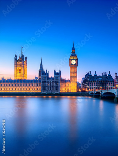 © Nadiyah, Fototapeta premium London Houses of Parliament at twilight, reflecting on the River Thames