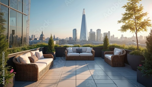 Obraz premium London rooftop terrace view on skyline. Modern architecture blends with city buildings. Lounge space offers seating with plants on sunny day. Urban garden design provides relaxation zone at summer.