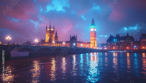 © MRSUTIN, Obraz premium London's iconic Big Ben and Parliament illuminated at night, reflecting vibrant colors on the Thames.