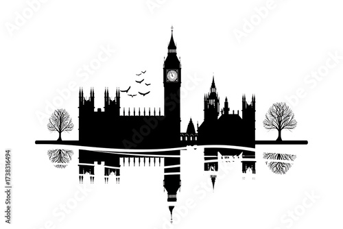 Naklejka premium London's iconic skyline featuring Big Ben and Houses of Parliament, with a touch of nature and reflection, creating a captivating silhouette design