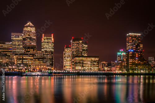 Fototapeta premium London skyline at night seen from across the river Thames, Canary Wharf is London’s financial district a place where the world’s greatest corporation and banks do business