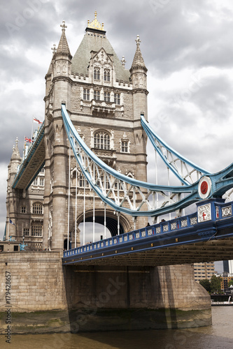 © luisrsphoto, Obraz premium London tower bridge side view on a cloudy sky