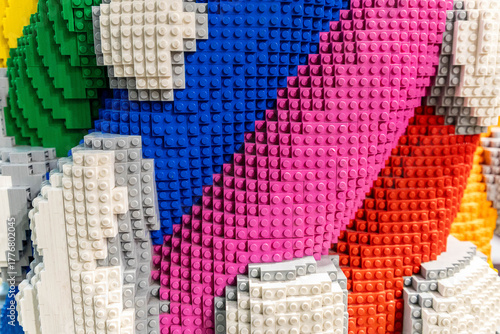 Naklejka premium London, UK: abstrakte Nahaufnahme von einem Regenbogen mit Wolken aus Legosteinen