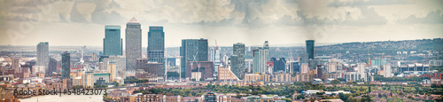 © jovannig, Fototapeta premium London - UK. Aerial panoramic view of Canary Wharf modern buildings on a cloudy day