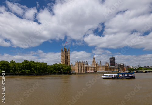 Naklejka premium London/ United Kingdom - 06.29.2020: A view of the Parliament and river Thames on a sunny day.