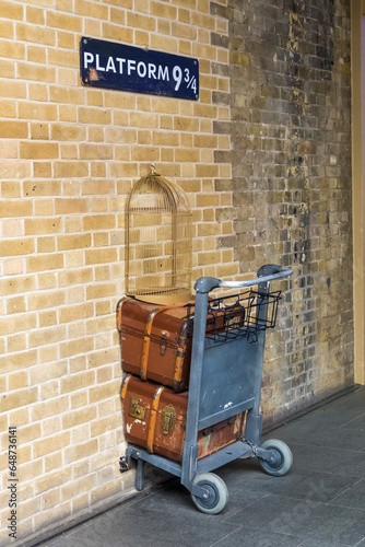 Fototapeta premium London, United Kingdom - 27 July 2016: Platform 9 3/4 photo spot at King's Cross station. Tourists can post photos with the trolley which stuck in the wall