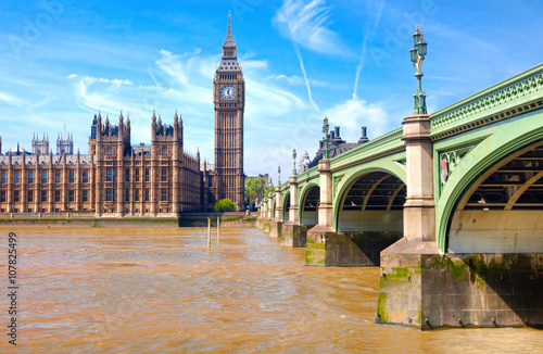 Naklejka premium London westminster houses of parliament and bridge on river thames in a sunny day