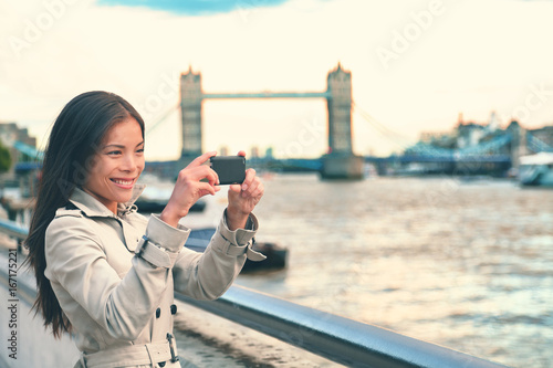 Obraz premium London woman tourist taking photo of Tower Bridge with mobile smart phone...