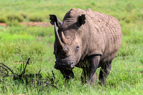 © robbyh, Obraz premium Lone African rhinoceros bull standing motionless while staring into the distance