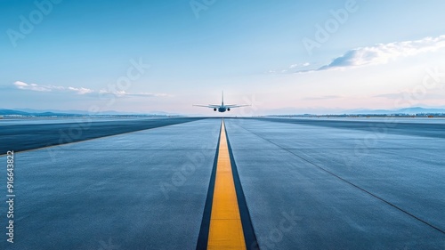 © cloud7days, Fototapeta premium Lone airplane gangway on tarmac, contrasting with vast runway.