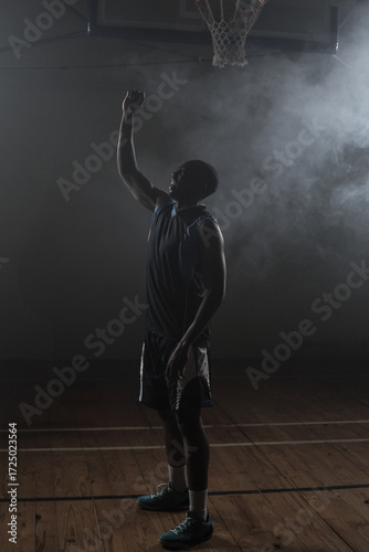 Fototapeta premium Lone athlete standing under basketball hoop on misty wooden court floor,...