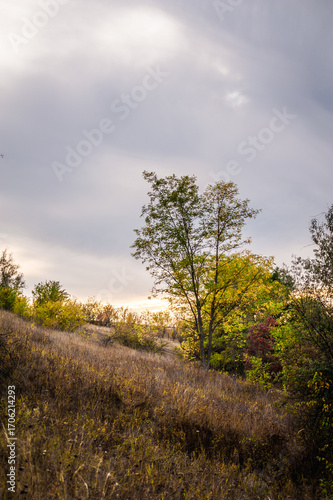 Fototapeta premium Lone autumn tree on a grassy hillside under cloudy sky