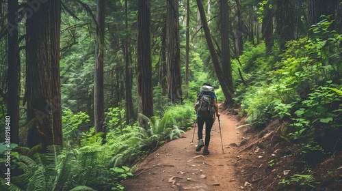 Obraz premium Lone backpacker trekking through dense forest with narrow path