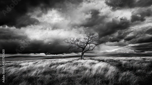 © Solikah, Obraz premium Lone bare tree in windswept field under dramatic cloudy sky