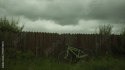 Obraz premium Lone bicycle against a rustic fence on a cloudy day