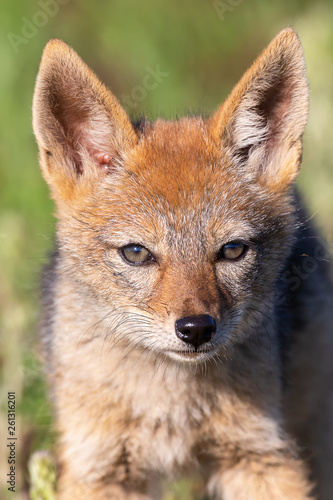 © Alta Oosthuizen, Fototapeta premium Lone Black Backed Jackal pup standing in short green grass to explore the world