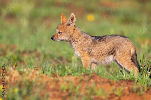 © Alta Oosthuizen, Fototapeta premium Lone Black Backed Jackal pup standing in short green grass to explore the world