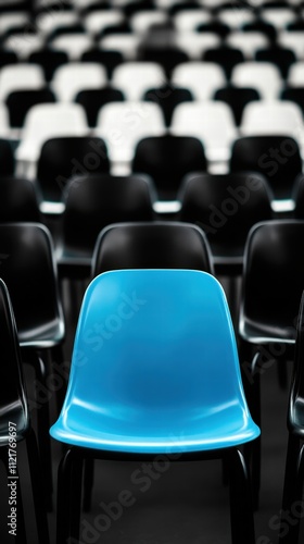 Fototapeta premium Lone blue stadium seat among blackandwhite rows