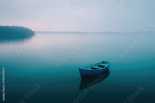 © Maria, Naklejka premium lone boat floats peacefully under overcast skies at ha long bay epitomizing vietnam natural serenity