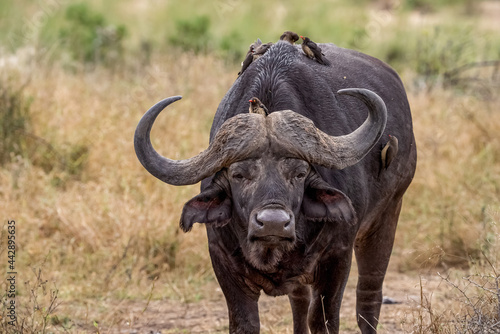 © Tekweni, Obraz premium Lone buffalo with huge horns facing camera and standing in African bush