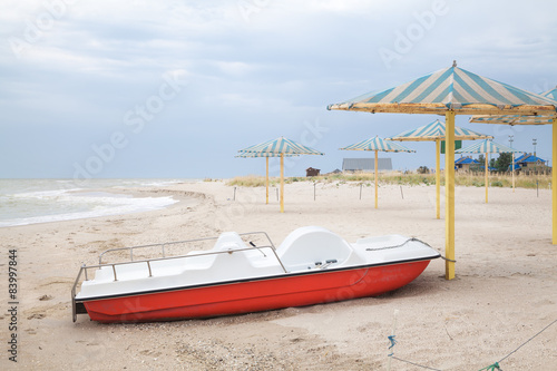 © glebchik, Fototapeta premium Lone catamaran on a deserted beach