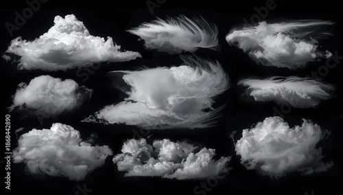 © VolumeThings, Obraz premium Lone cloud display on dark backdrop. Various cloud forms. Artistic. Mist. Haze. Abstract. White fluffy textures