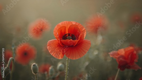 © AkuAku, Obraz premium Lone crimson poppy against plain backdrop